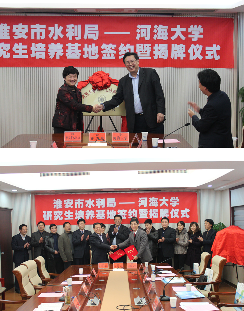 12月31日,河海大学与淮安市水利局共建研究生培养基地签约暨揭牌仪式在淮安举行。河海大学研究生院常务副院长姚纬明、淮安市水利局副局长姚丽鸣为基地揭牌,河海大学研究生院副院长束龙仓和淮安市水利局副局长冯桂田签署共建协议。