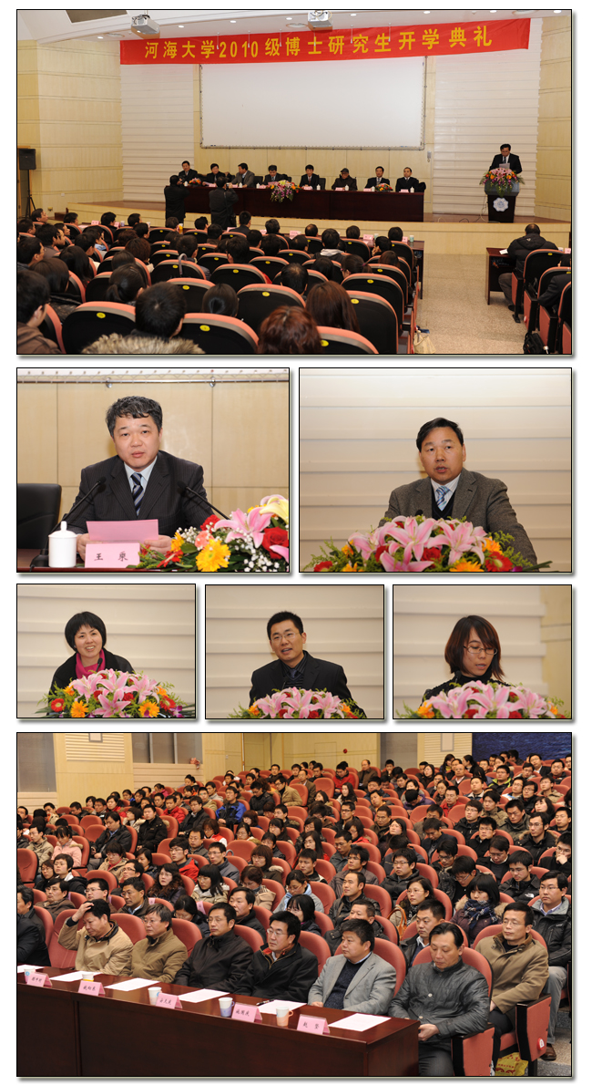 3月5日下午,河海大学隆重举行2010级博士研究生开学典礼。校党委书记朱拓,校长、研究生院院长王乘、中国工程院院士吴中如,典礼嘉宾、江苏省水利厅副厅长陆桂华,党委副书记郑大俊、王济干,副校长朱跃龙、徐卫亚出席典礼。校长助理郑垂勇、戴会超以及各有关学院、职能部门、研究生院领导参加典礼。