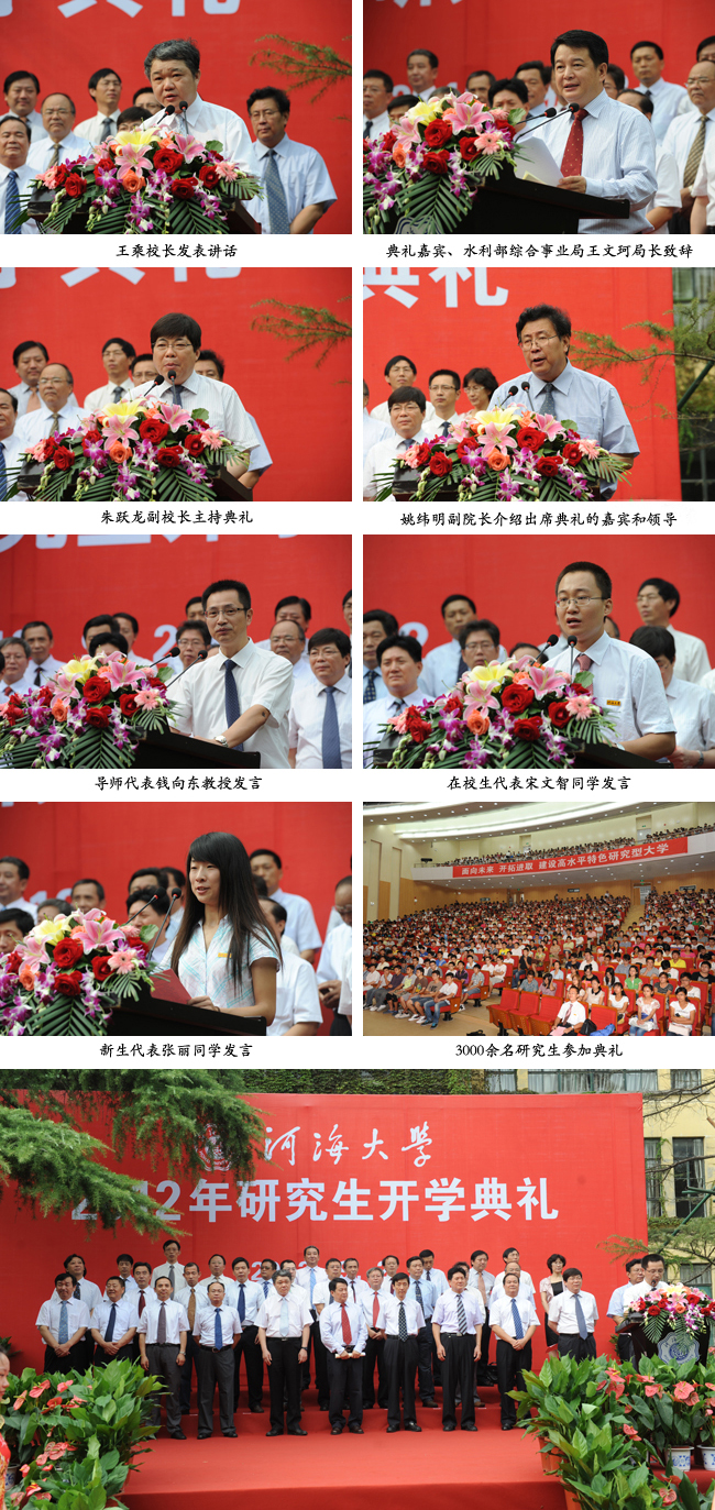 9月2日,我校隆重举行2012级研究生开学典礼。校党委书记朱拓,校长兼研究生院院长王乘,典礼嘉宾、水利部综合事业局局长王文珂,副校长鞠平,党委副书记陈德奎,副校长朱跃龙,党委副书记王济干,副校长李乃富,副校长徐卫亚出席典礼。