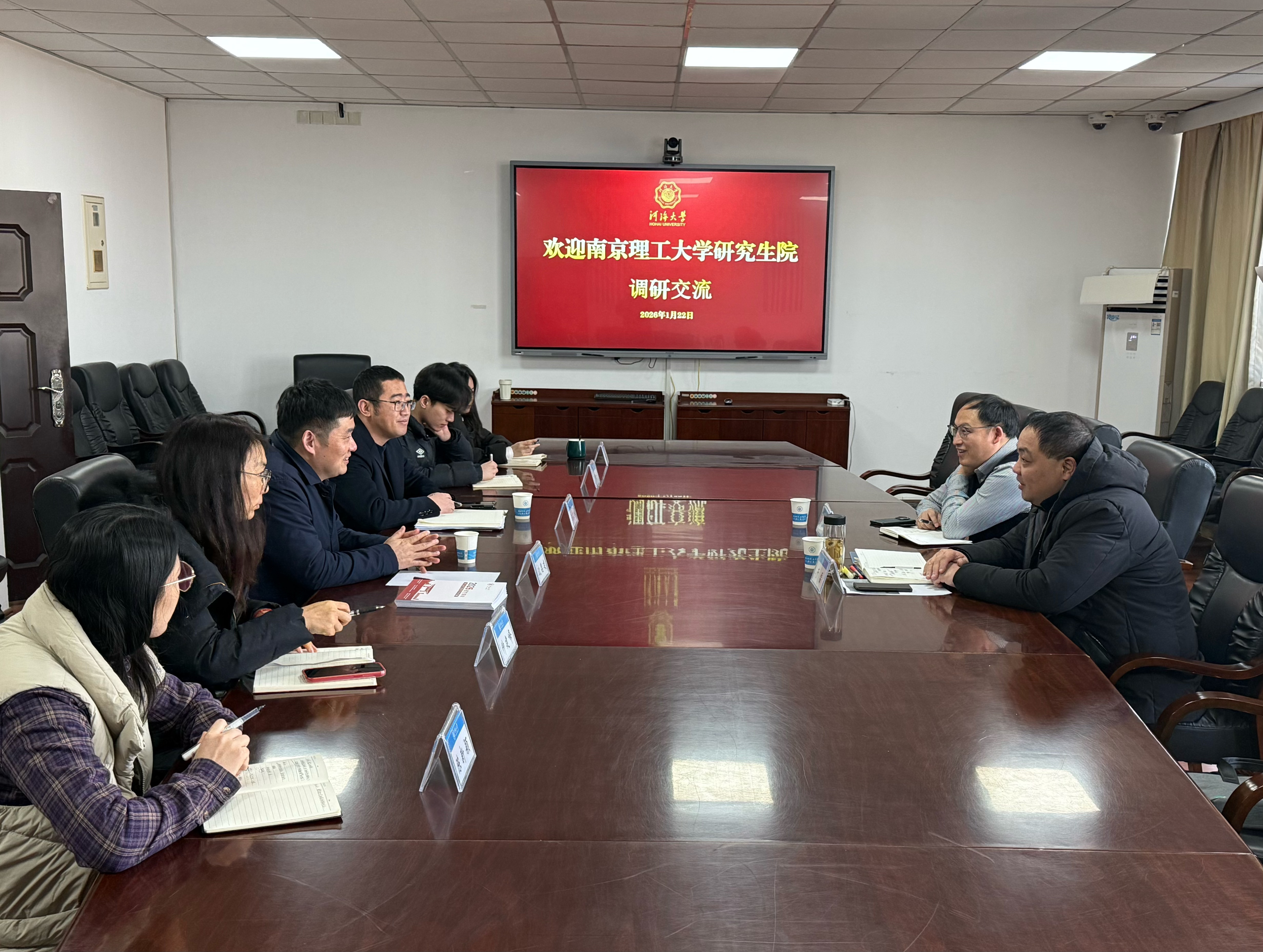 2026年1月22日,南京理工大学研工部部长兼研究生院副院长于雷一行来院调研,交流研招工作的改革创新。河海大学研究生院常务副院长沈德建主持座谈,研招办主任王森林及研招办其他成员参加座谈。